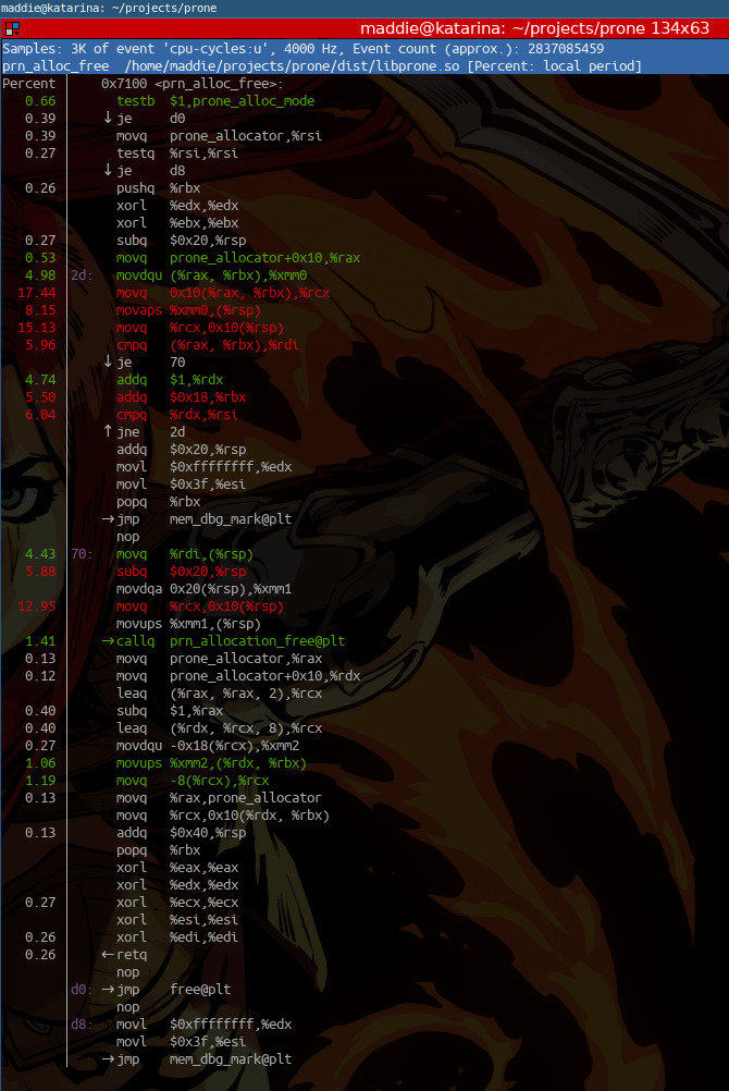 Currently, the allocator operates in one of a handful of preset modes, with functions to set the mode, get metadata, etc. Most of the test suite operates in TRACKED mode in order to detect memory leaks. Tracked mode actually maintains a global Vec of allocation data, which allows us to see whether we freed all the memory we allocated, and print diagnostics. There is a FAST mode that just immediately defers to system malloc/free, and you can see in the assembly how prn_alloc_free tries to check for fast mode and dispatch accordingly as early as possible.